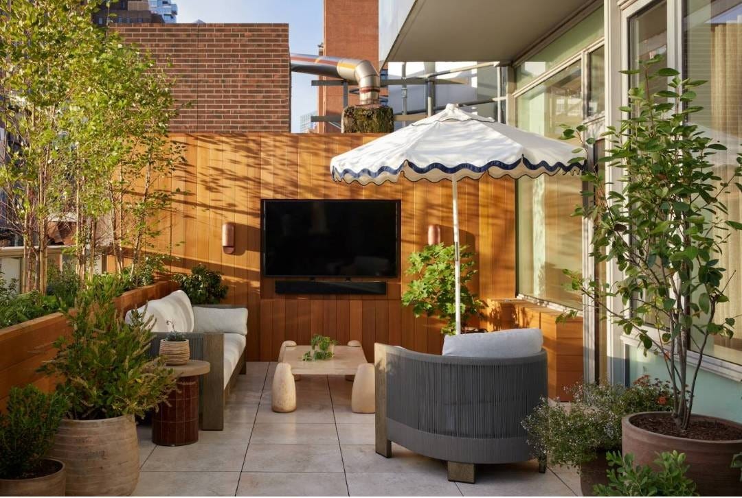 Dirt Queen NYC made this balcony welcoming to both humans and pollinators. Notice how the small trees along the left create a sense of security, while the TV — a client request — makes the seating area a destination. (See additional images at Gardenista.) Read my article about how to make small awesome.