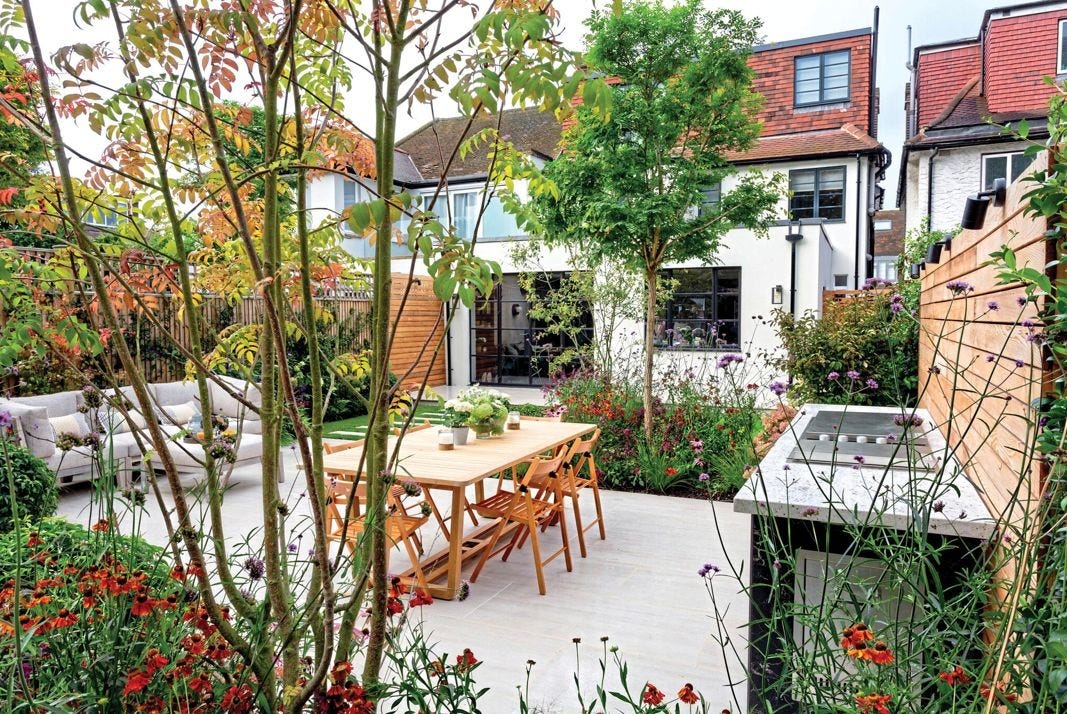 This is a good example of how adding plants expands, rather than decreases, the sense of space in a narrow urban yard. Open, multi-stemmed trees break the length into rooms, while vines and other greenery along the fences “blur the edges.” The lounging and dining areas and a new path to the shed-office create destinations, so the owners spend time — and entertain others — in the once bare yard. This five-week transformation cost roughly $36,000, including $12,000 for paving and $11,000 for plants.