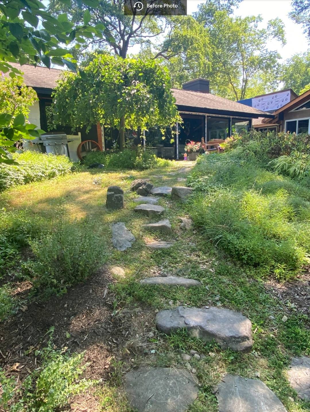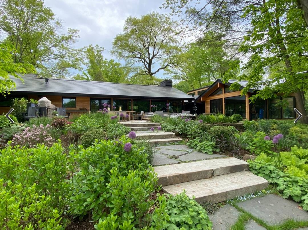 This “before” has a homey, naturalistic feel, but the stepping stones aren’t functional. In the “after,” the steps, which complement the modern house stylistically, draw you through the more densely planted landscape — and down to a lake below. Landscape designer Ronni Hock says,