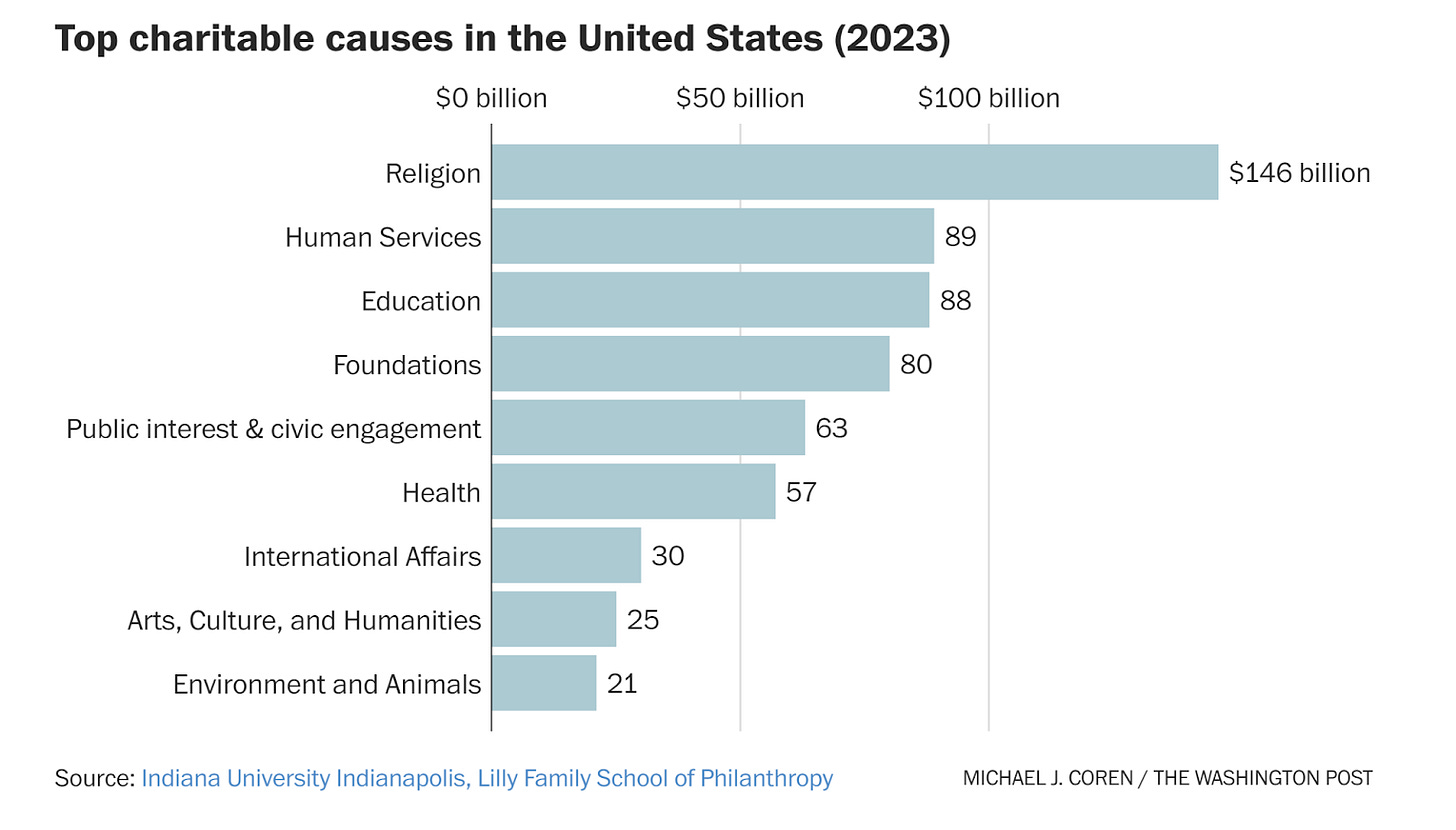 So far, the documented loss of nature and nature connection have not broadly roused Americans to action — or at least, to putting their money toward change. Environmental and animal causes rank last out of nine giving categories. Americans contribute seven times as much to religious causes as to environmental ones.