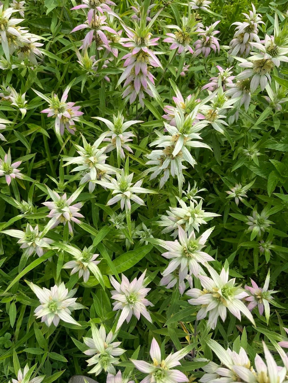 Spotted bee balm (Monarda punctata), native to much of the eastern two thirds of the United States, is one of the big successes in my Rhode Island yard this year. In October, I cast their seeds onto an area of turf that had been covered with plastic for six weeks. And voila! By August, the area is filled with Dr. Seuss-like flowers, usually covered in native bees.