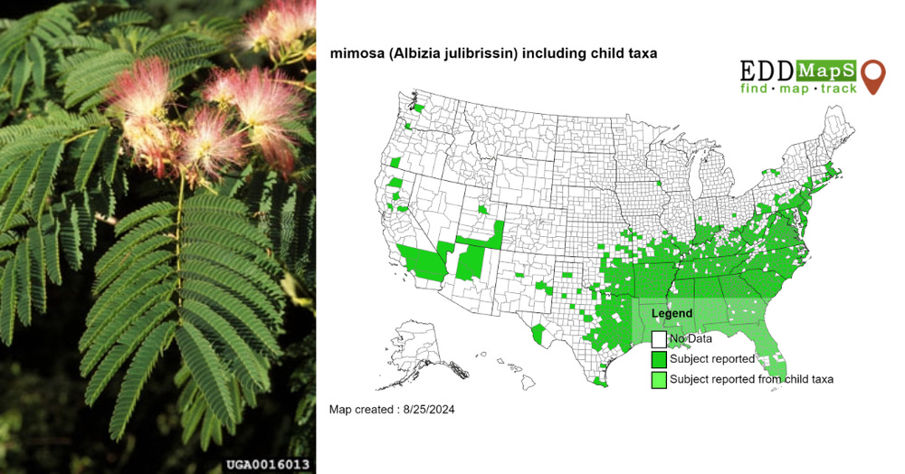 Noooooooooooo! That gorgeous mimosa (Albizia julibrissin), also called silk tree, is native to Asia and was introduced to the United States in 1745 for use as an ornamental plant. According to the Bugwood Center for Invasive Species and Ecosystem Health,