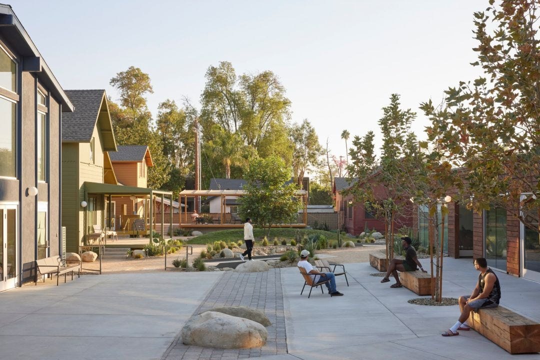 Terremoto landscape architects used decomposed granite paths and wood bridges to connect areas of a shared community garden in Riverside, California. The garden also includes bleacher seating, a large central meeting tree, an activity plaza, vegetable beds, a stormwater swale and vibrant native plantings. Around the garden are 1920s craftsman-style bungalows developed as a safe, inclusive, and nurturing environment for the formerly homeless, LGBTQ+ community, senior citizens, and young people coming out of the foster care system.