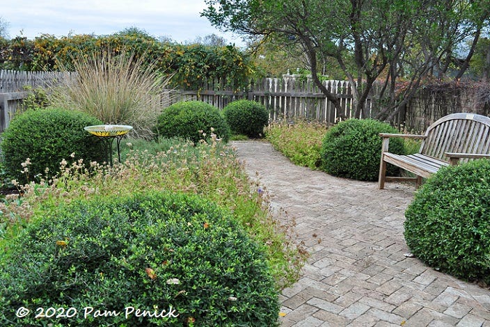 I hope you aren’t scared away by the formality of traditional Virginia gardens with brick walkways, a yardenality Zoe and I call Courtyard Chic. You can certainly incorporate lots of native plants into Courtyard Chic, as in the example below in Texas (with a fence that reminds me of yours). But brick is also characteristic of Blooming Romantic gardens, like Vita Sackville-West’s Sissinghurst.