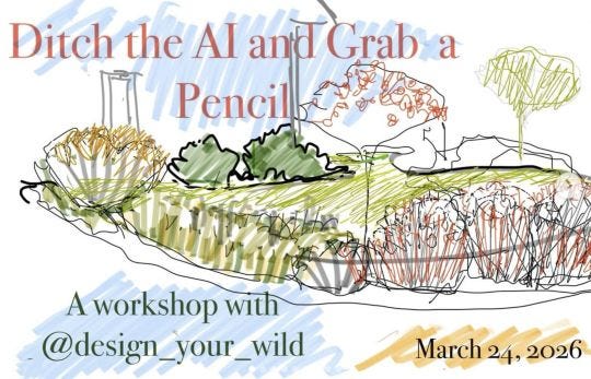 Want to actually see what your design will look like before you dig? In this hands-on workshop, artist and landscape designer Liza Kiesler of Viburnum Gardens will teach you (and Zoe and me) to test your ideas by sketching them onto photographs. Sketching will also improve your attention span, ability to stay focused, and your ability to think outside stereotypes (The Cognitive Benefits of Art). No drawing experience necessary—but iPads and Apple Pencils recommended.