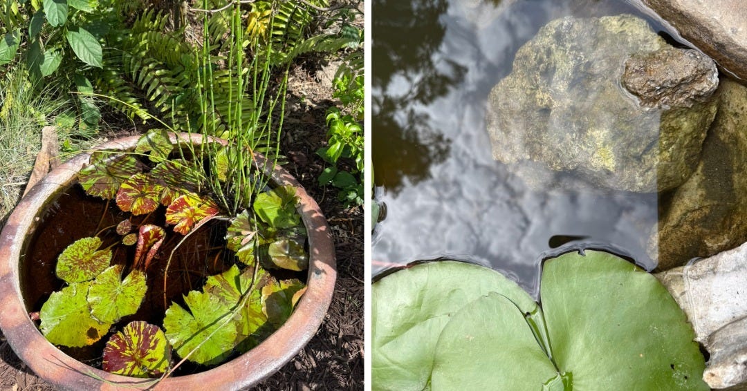 Contrary to most of what you’ll read online, wash off any soil from the roots and replant them in gravel or rocks at their preferred depth. And do not fertilize. Add a large rock or two so birds can bathe and other critters can climb out. If mosquitoes are a problem, add a Dunk or tiny gambusia fish; eventually, dragonfly larvae should control the mosquito larvae.