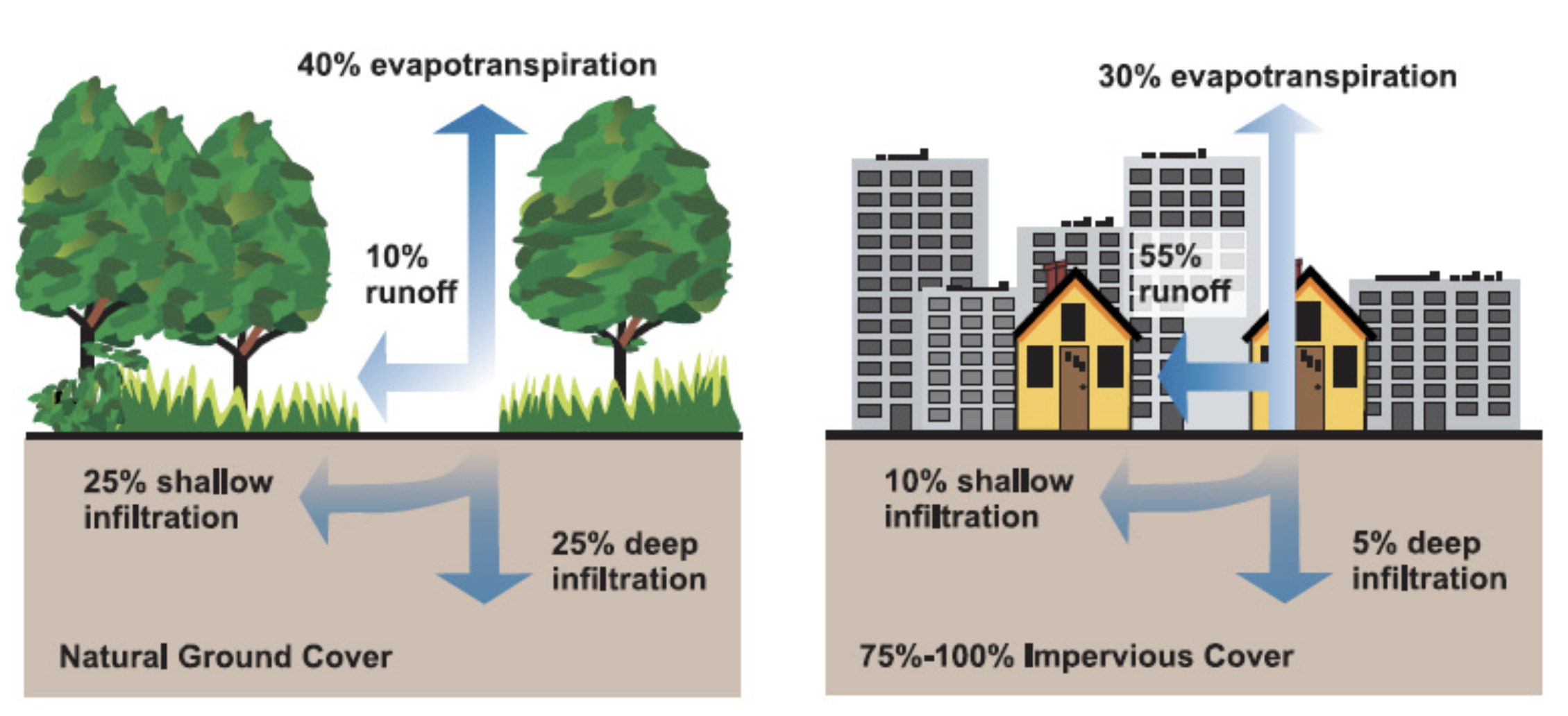 In naturally vegetated landscapes, most of this stormwater absorbs into the soil or evaporates or is transpired by plants, leaving little runoff. In cities, where much of the ground is covered by impervious surfaces—buildings, roads, parking lots, etc.—more than half the total rainfall may become runoff, causing a raft of problems. Lawns contribute to the runoff problem, because they absorb one tenth as much rainwater as natural vegetation, according to the EPA.