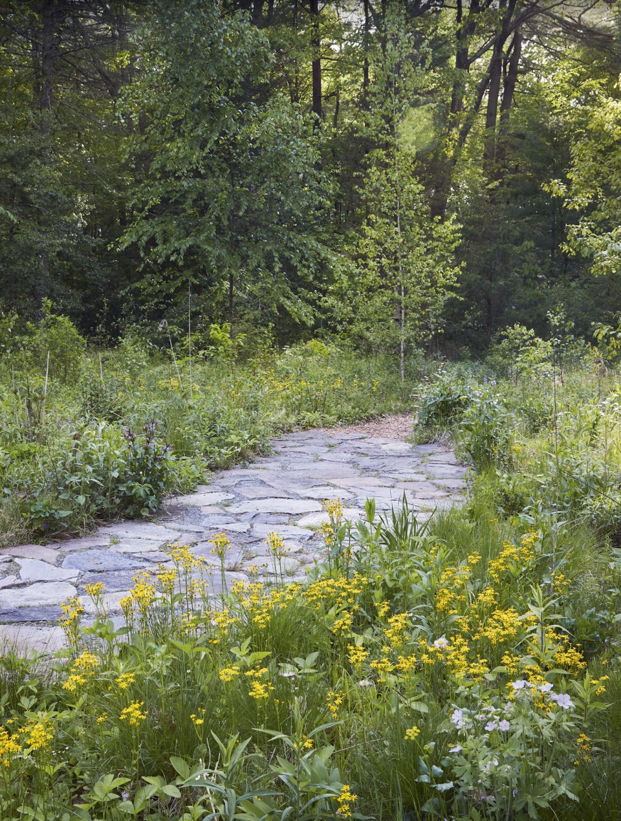 Yellow roundleaf ragwort (Packera obovata) and pink Geranium maculatum edge a stretch of the mile-long network of trails that weave through the garden.—Gardens Illustrated