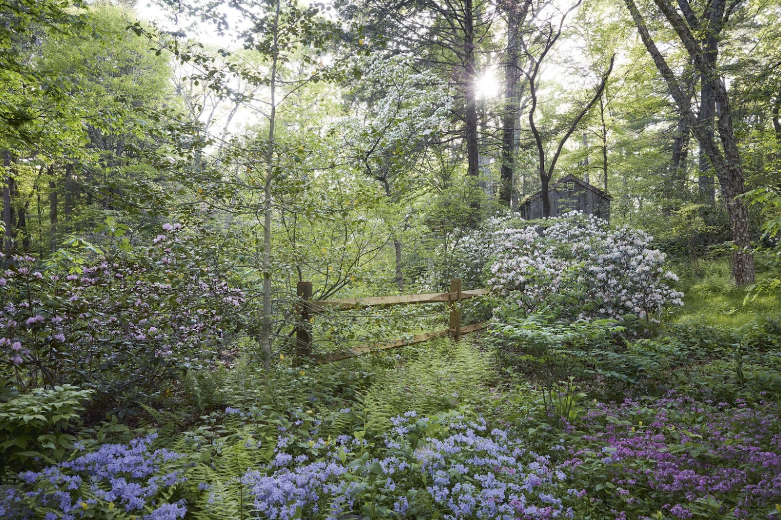 Garden in the Woods provides niche conditions for a range of native plants, from low drifts of colourful Phlox divaricata ‘Blue Moon’ and P. stolonifera ‘Sherwood Purple,’ and clumps of yellow Trillium luteum to flowering shrubs including American holly (Ilex opaca) and Carolina rhododendron (Rhododendron minus).—Gardens Illustrated