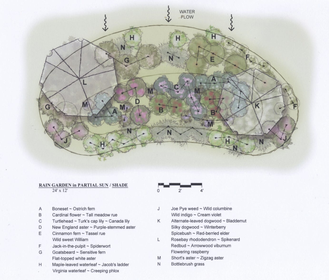 Your native plant plugs washed away because the small, young plants were no match for the rushing water. In addition, the most common Carex (pensylvanica), doesn’t like too much water. In a rain garden, water will pool at the bottom, not flow, and plants like the ones below that like their feet wet will thrive.
