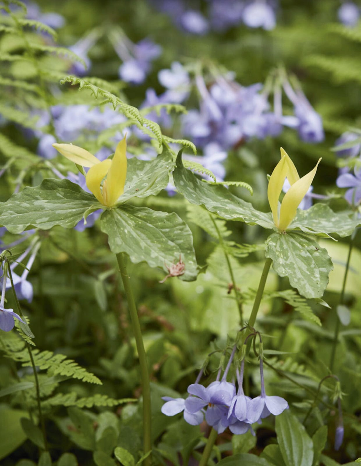 Trillium luteum. The luminous yet refined yellow trillium (pictured here with blue Phlox divaricata) is citrus-scented and ephemeral, retreating underground after spring.—Gardens Illustrated