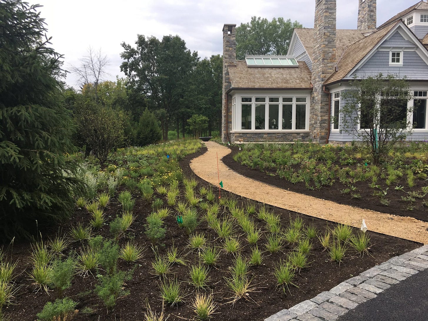 Everywhere except paths and rooms, install dense layers deep-rooted of native plantsâgroundcovers, shrubs, trees. Cover soil around new plants with a temporary mulch of up to three inches of dead leaves.
